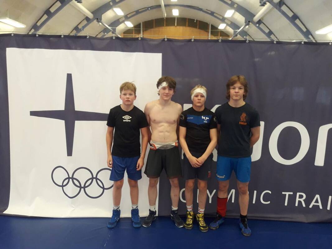 Keski-Suomesta 4 painijan edustus Kuortaneella Himberg-haastajaleirillä. Harjun Woimalta mukana Onni Silvennoinen ja Taisto Riutta-aho, Suolahdesta Kasperi Kankkunen ja Joni Pitkänen.