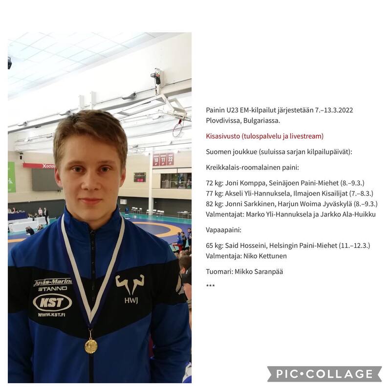 Harjun Woiman viime vuoden juniorien EM-pronssimitalisti Jonni Sarkkinen on valittu U23 EM-kisoihin edustamaan Suomea sarjaan 82kg. Painin U23 EM-kilpailut järjestetään 7.–13.3.2022 Plovdivissa, Bulgariassa.