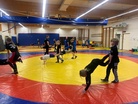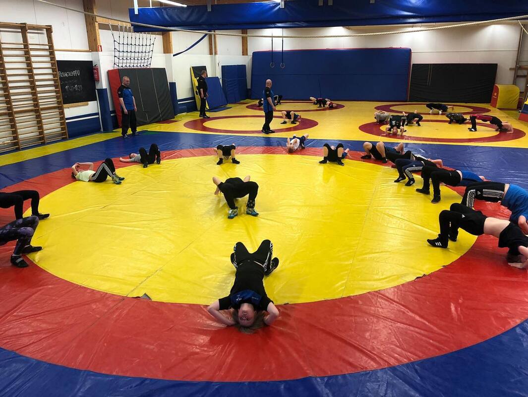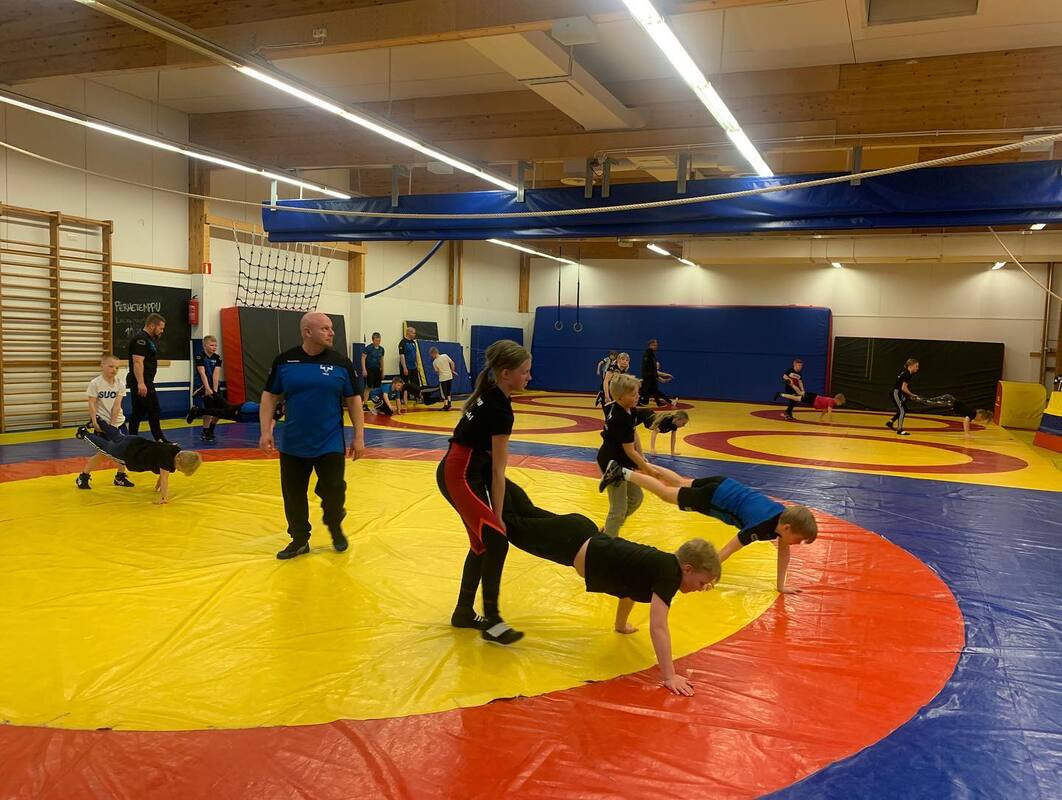 Painikoulussa riitti vauhtia ja sali oli lähes täynnä, kun saatiin treeneihin vierailijoiksi naapuriseuran Vaajakosken Kuohun painikoululaiset.