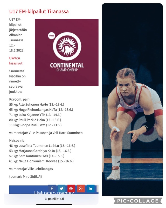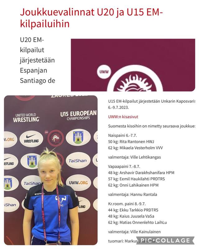 HWJ:n Sara Rantonen on valittu 12.-18.6.2023 painittaviin U17 EM-kisoihin Albanian Tiranaan. Saran painii sarjassa 57kg ja Saran kisapäivät on 14.-15.6.2023 Rita Rantonen puolestaan on valittu 6.-9.7.2023 painittaviin U15 EM-kisoihin Unkarin Kaposvariin. Rita painii sarjassa 50kg ja Ritan kisapäivät on 6.-7.7.2023 Tsemppiä kisoihin! |