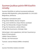 Harjun Woiman 21-vuotias Jonni Sarkkinen lunasti kevään ja kesän kansainvälisillä näytöillä paikan Suomen MM-joukkueessa. MM-kisat painitaan Belgradissa Serbiassa 16.-24.9. ja Suomi lähettää edustajan viiteen olympiasarjaan. Niissä on tänä vuonna erityistä painoarvoa, koska MM-mitalien lisäksi jokaisen sarjan viisi parasta lunastaa maapaikan Pariisin Olympialaisiin. Sarjassa 77 kg otteleva Jonni Sarkkinen vakuutti valitsijat maaliskuisella U23 Europanmestaruudella sekä kahdella onnistuneella suorituksella kesän kovissa turnauksissa. Sarkkinen paini viidenneksi sekä Budapestissa Ranking Series turnauksessa heinäkuussa että Grand Prix of Germany turnauksessa Dortmundissa viime viikonloppuna. Molemmissa kilpailuissa matkalla mitaliotteluun kaatui useita kovia kansainvälisiä vastustajia. Kovin kilpailu edustuspaikasta käytiin Sarkkisen ja Lapuan Virkiän Mikko Peltokankaan välillä. Peltokangas on sarjan hallitseva Suomenmestari ja kevään EM-edustaja. Kolmas ehdokas sarjan edustajaksi oli Ilmajoen Kisailijoiden Akseli Yli-Hannuksela, mutta hän joutui loukkaantumisen takia jättämään väliin molemmat kesän katsastuskilpailut. Suomen joukkue leireilee tämän viikon Saksassa Hennefin valmennuskeskuksessa. Urheilukoulussa varusmiespalvelun viimeisiä viikkoja suorittava Sarkkinen harjoittelee ensi viikon Santahaminasta käsin ja sitten on edessä viimeinen valmistava kansainvälinen leiri Kuortaneella 28.8.-6.9. Kotiutumisen ajankohta osuus MM-matkan ajalle, joten sotilaspassin noutaminen todennäköisesti siirtyy. Keskisuomalainen painija yleisen sarjan MM-joukkueessa ei ole kovin tavanomaista. Viimeisimmät Keski-Suomessa asuvat ja täkäläistä seuraa edustavat MM-painijat ovat Vaajakosken Kuohun Sami Salminen vuosina 1994 ja 1995 sekä saman seuran Juha Virtanen, joka edusti Suomea neljä kertaa MM-kisoissa vuosina 1989-1993. Tuomo Mäntylä edusti Kuohua MM-molskilla 2003 ja 2005, mutta hän asui Alavudella. Jyvässeudun Paini-Ässien Ville Pasanen edusti Suomea EM-kisoissa 2009, mutta ei kuitenkaan edennyt MM-joukkueeseen. Nykyinen olympiavalmentaja Juha Lappalainen asui Suolahdessa vuosien 2001 ja 2003 MM-urheilijana, mutta hän edusti vantaalaista Ylä-Tikkurilan Kipinää. Jyväskyläläinen naispainija Hajar Ashtiani edusti Suomea MM-kisoissa 2006, mutta hänen seuransa silloin oli Helsingin Paini-Miehet. |