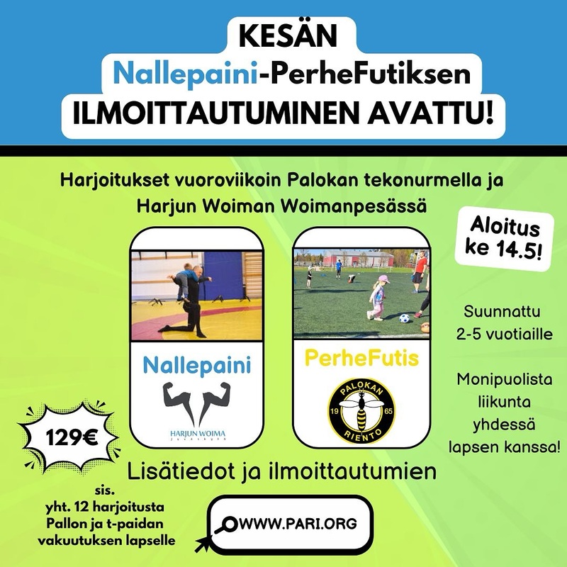 Ilmoittautuminen tähän ryhmään Palokan Riennon sivujen kautta: https://www.pari.org/harr…/kesan-2025-perhefutis-nallepaini/ |